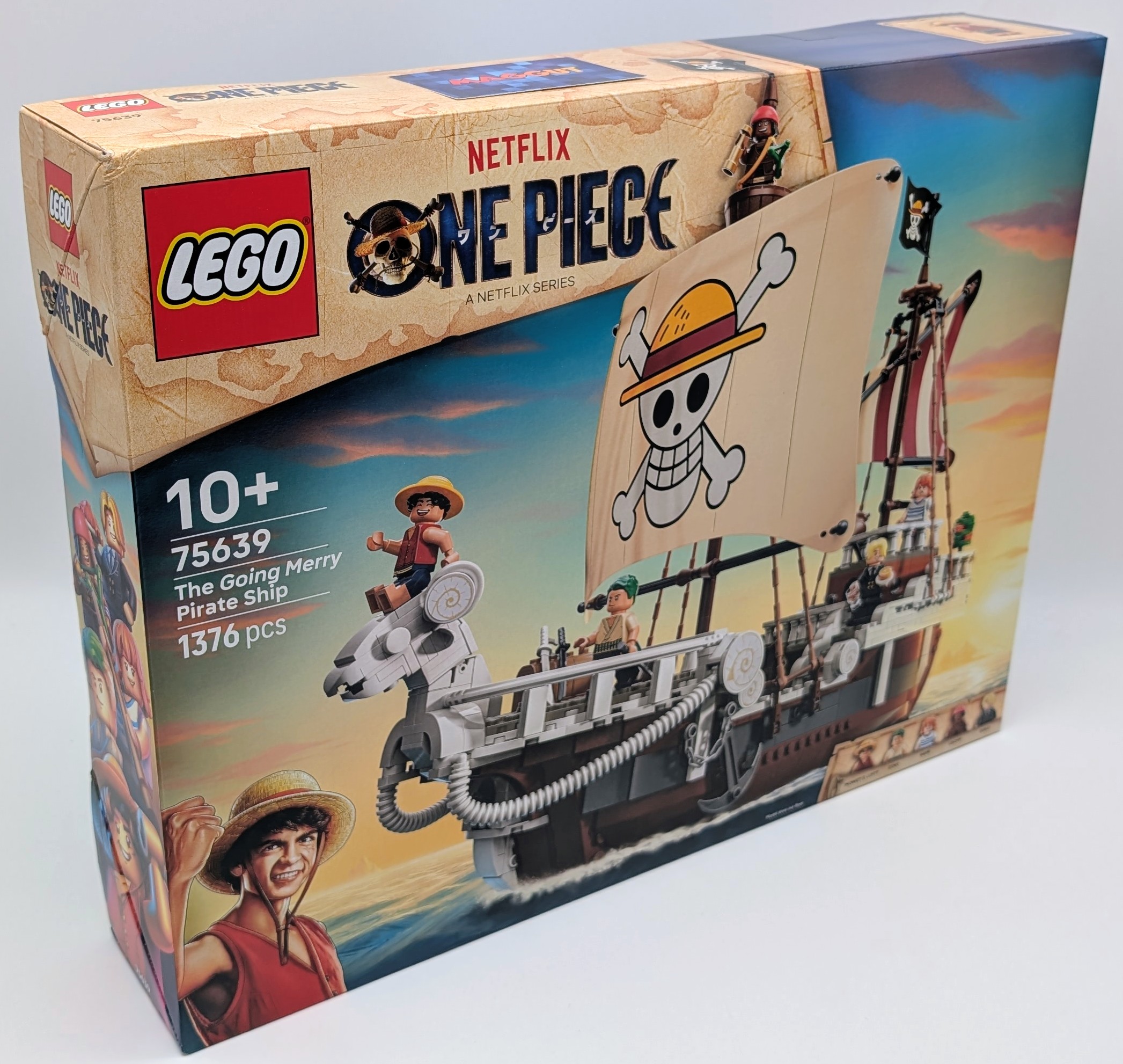 In dem Schiff sind mehrere Räume untergebracht: eine Kabine für die Crew, eine Kombüse, ein Lagerraum und eine Werkstatt. Zu dem Modell gehören auch 5 LEGO ONE PIECE Minifiguren. Ruffy sitzt über einer Kanone auf der Schaf-Galionsfigur am Bug. Zorro relaxt und trainiert auf dem Deck. Nami steht am Steuer am Heck, wo ihre geliebten Mandarinenbäume auf dem Deck wachsen. Lysop klettert die Masten hinauf und hält im Ausguck Ausschau nach anderen Schiffen. Und Sanji trägt Töpfe in die Kombüse hinunter. Auch 4 Steckbriefe liegen bei. In der LEGO Builder App können Kinder 3D-Ansichten der Modelle vergrößern und drehen und ihren Baufortschritt digital verfolgen. Das Set besteht aus 1.376 Teilen.